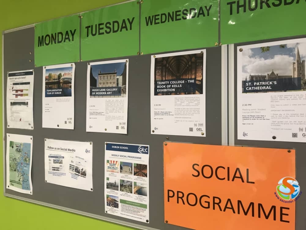 不論是在學生休息區或是教室裡,學校都會把當月的課後活動行程張貼在佈告欄上。有興趣參加的同學,只要透過學校的ATC-online提出申請即可,但如果需要付錢的則是要去櫃枱付費喔!,在都柏林並不是每間學校都用這麼先進的系統。難怪學校這麼大,樓下的櫃枱居然只有一個人就夠!原來是有這個系統把很多業務都科技化了。就不會發生下課時間櫃枱像菜市場一樣的吵雜!對於工作人員和學生真是一大福音呢!