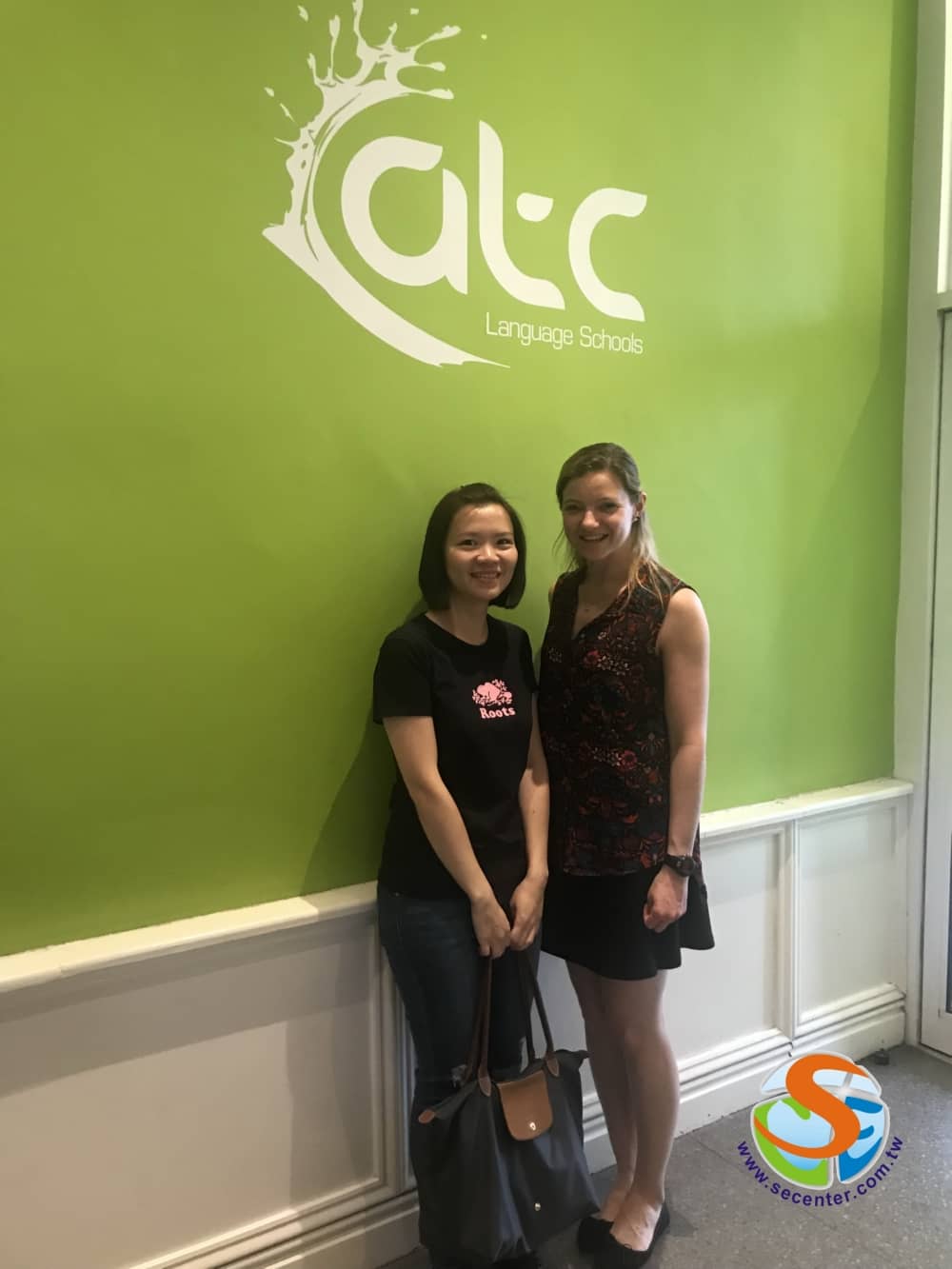 一進門後就是接待櫃枱,這間學校採用的顏色為綠色系。進門後就可以看到牆上有很大的學校名字用綠底白字襯托著。學校共有五層樓並設有電梯,最頂樓為辦公室,四樓則為學生交誼廳,剩下的樓層則是教室。