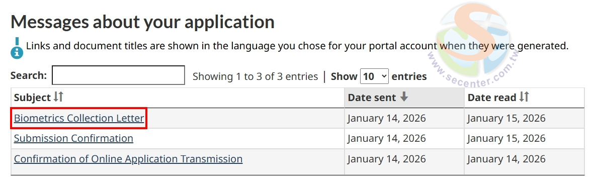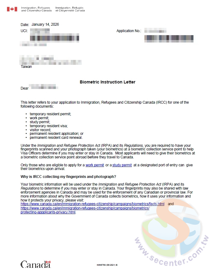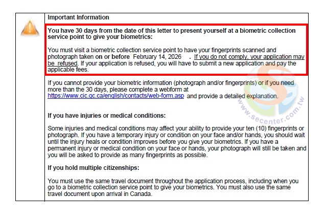 ♦在加拿大簽證申請中,做指紋辨識(Biometric Enrolment)以前,申請人會收到官方通知或訊息,主要內容如下: