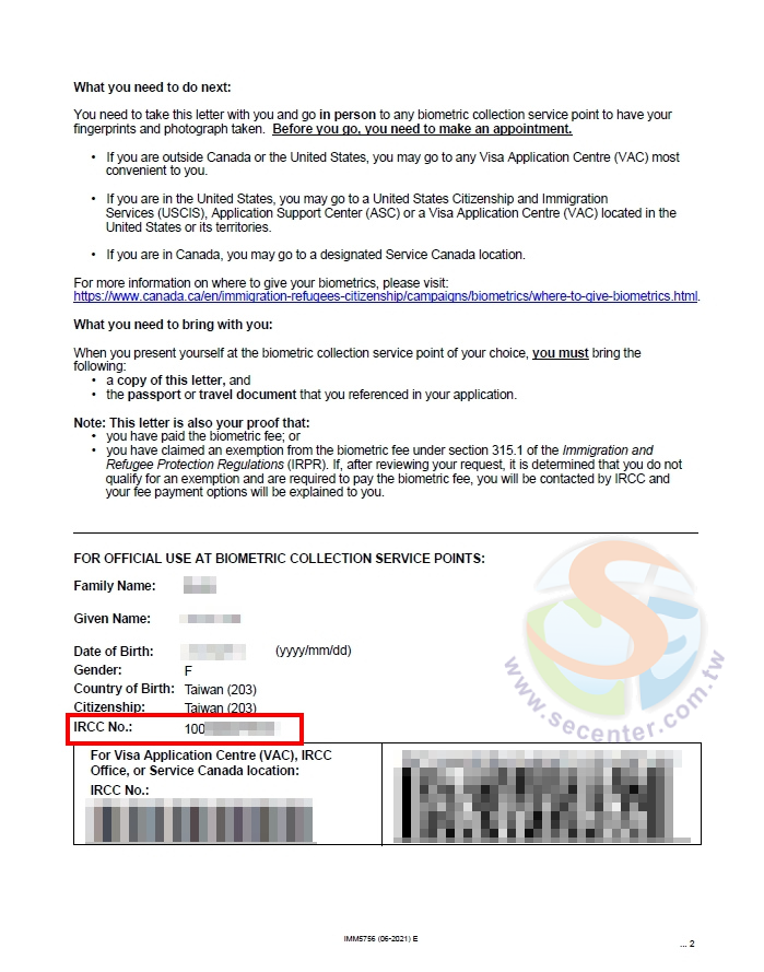 •第二頁會顯示申請者的姓名、生日、性別、國家以及IRCC No.