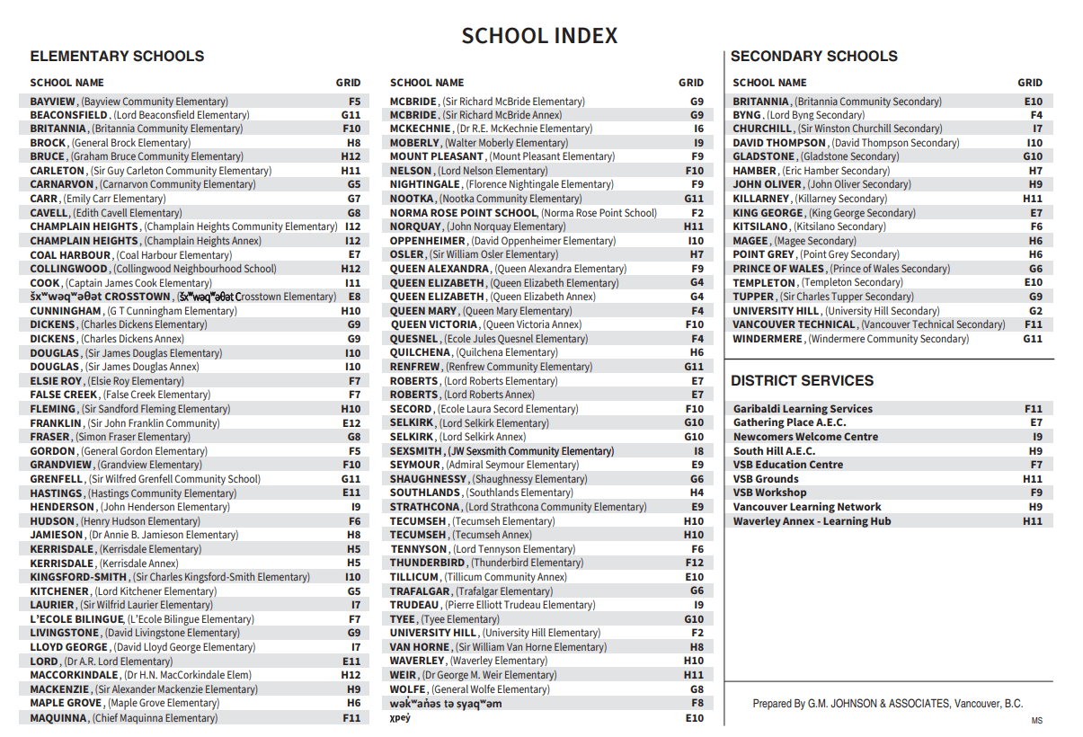 VSB 的校區非常多元,設有 89 所小學、18 所中學、1 所成人教育校以及遠距學習學校。他們提供許多特色課程:包括法語浸入課程、普通話雙語、IB(國際文憑)、蒙特梭利、精美藝術和原住民教育等。