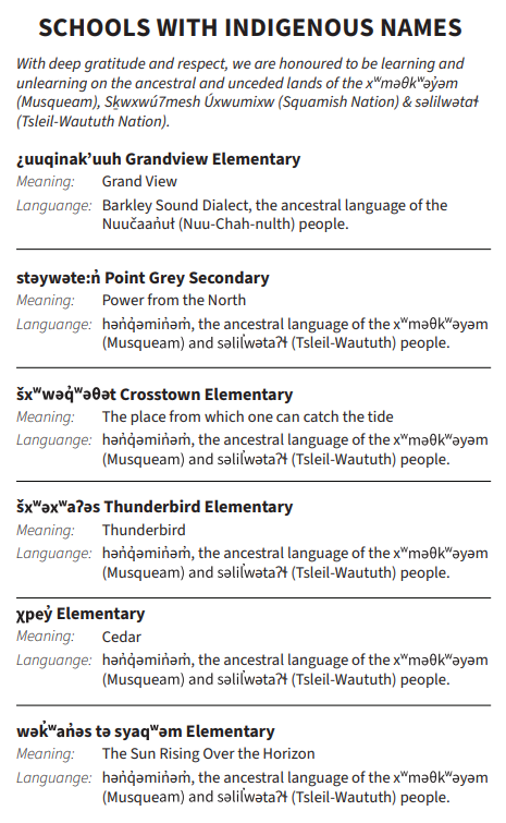 其教育計畫中融入原住民知識與學習方式,尊重 xʷməθkʷəy̓əm (Musqueam)、Sḵwxwú7mesh (Squamish) 和 səlilwətaɬ (Tsleil-Waututh) 等原住民族的文化與歷史。