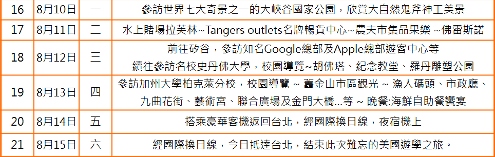 經濟艙來回機票、機場稅、燃料稅、課程+活動費、美國ESTA、旅遊交通費、行程中安排之食宿費、 1,000萬履約保證保險、500萬意外險(15歲以下250萬)+20萬意外醫療險、旅遊期間司機導遊小費