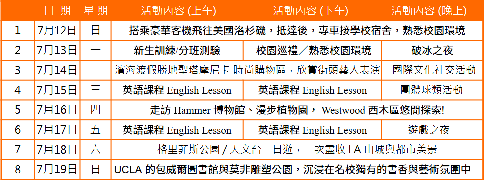 UCLA加州大學洛杉磯分校創立於1919年,是加州大學中最具知名度的高等學府,也是聞名世界的教學及研究機構,向來以嚴謹教學、高水準師資以及現代化設備著稱。學校目前擁有三萬四千多名學生和眾多傑出的教師,包括諾貝爾獎得主及著名的「福特研究金」的學者。校園位處Westwood西木區,是洛杉磯地區最精華的地段,也是最安全與時尚的區域。距離比佛利山莊,聖塔莫尼卡海灘也僅須十幾分鐘車程,校區廣闊猶如公園般美麗,校園風格以義大利文藝復興時代建築聞名,其中的包威爾圖書館(Powell Library)成為好萊塢電影的最佳拍攝場景。學校還提供了豐富的文化和休閒資源,校園中有表演藝術中心、雕塑公園和體育運動場。本暑期英語課程是由 OSI 國際教育機構所安排,豐富的教學經驗及多年承辦國際夏令營的團隊,將傳統的英語教學與文化教育活動結合及配合多國文化交流的環境,不僅提供學生一個快樂、安全的學習環境,也力求學員在享受假期的同時,有效地增強英語能力。