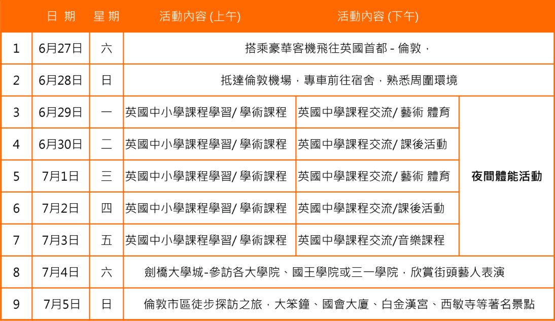 經濟艙來回機票、機場稅、燃料稅、課程、活動費、旅遊交通費、行程中安排之食宿費、 1,000萬履約保證保險、500萬意外險(15歲以下200萬)+20萬意外醫療險 、英國ETA