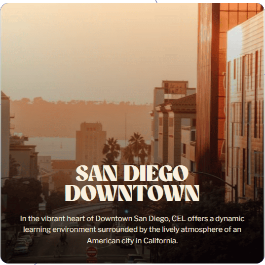我們的聖地牙哥市中心校區距離巴爾博亞公園、瓦斯燈街區和小義大利等標誌性景點僅幾分鐘路程,為學生提供沉浸式體驗美國城市的活力。從體育和購物到餐飲、精釀啤酒和藝術,我們的學生發現自己處於教育和娛樂的交叉點。快來加入我們這個沿海天堂吧,在這裡學習英語不僅僅是一次旅程,更是在我們位於加州聖地亞哥市中心的語言學校對文化和語言的探索。