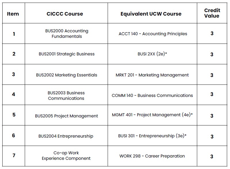 CICCC 國際商管 轉至 UCW 商學學士學位(BCom),可抵課程學分如下圖: