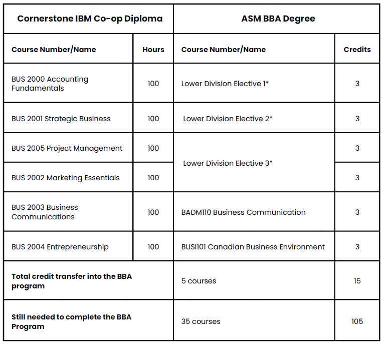 CICCC 國際商管 轉至 ASM 工商管理學士學位 (BBA),可抵課程學分如下圖: