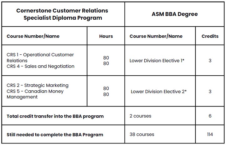 CICCC 顧客服務 轉至 ASM 工商管理學士學位 (BBA),可抵課程學分如下圖: