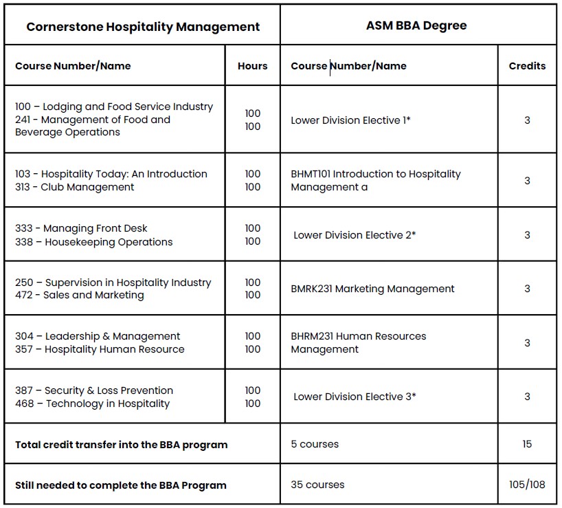 CICCC飯店管理 轉至 ASM 工商管理學士學位 (BBA),可抵課程學分如下圖: