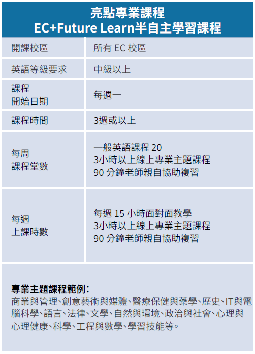 EC提供多樣化英語課程,結合口說、聽力、閱讀與寫作訓練,