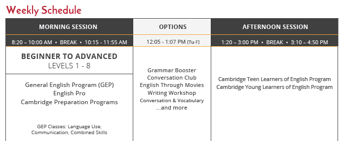 *此圖表僅供參考。 GV Hawaii保留根據學生在開課第一天進行的綜合口試和筆試成績確定其年級的權利。不同年級的課程時長各不相同。