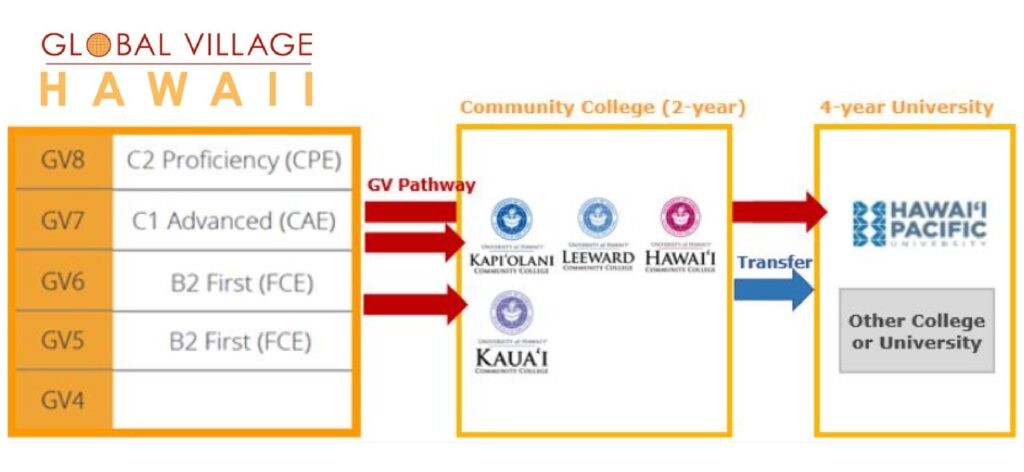 GLOBAL VILLAGE 與夏威夷和整個美國的高等教育機構簽訂了銜接協議。學生可以透過資深師群獲得大學申請的諮詢和幫助,並加強高水平的學術英語,學術寫作和研究技能。