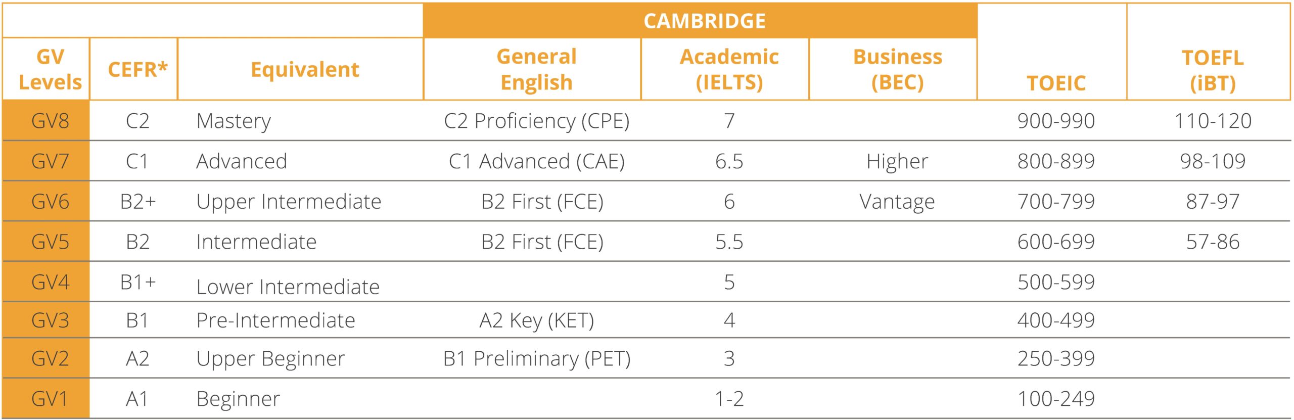 - GV共分8級英語程度,入學將會進行程度分級考試