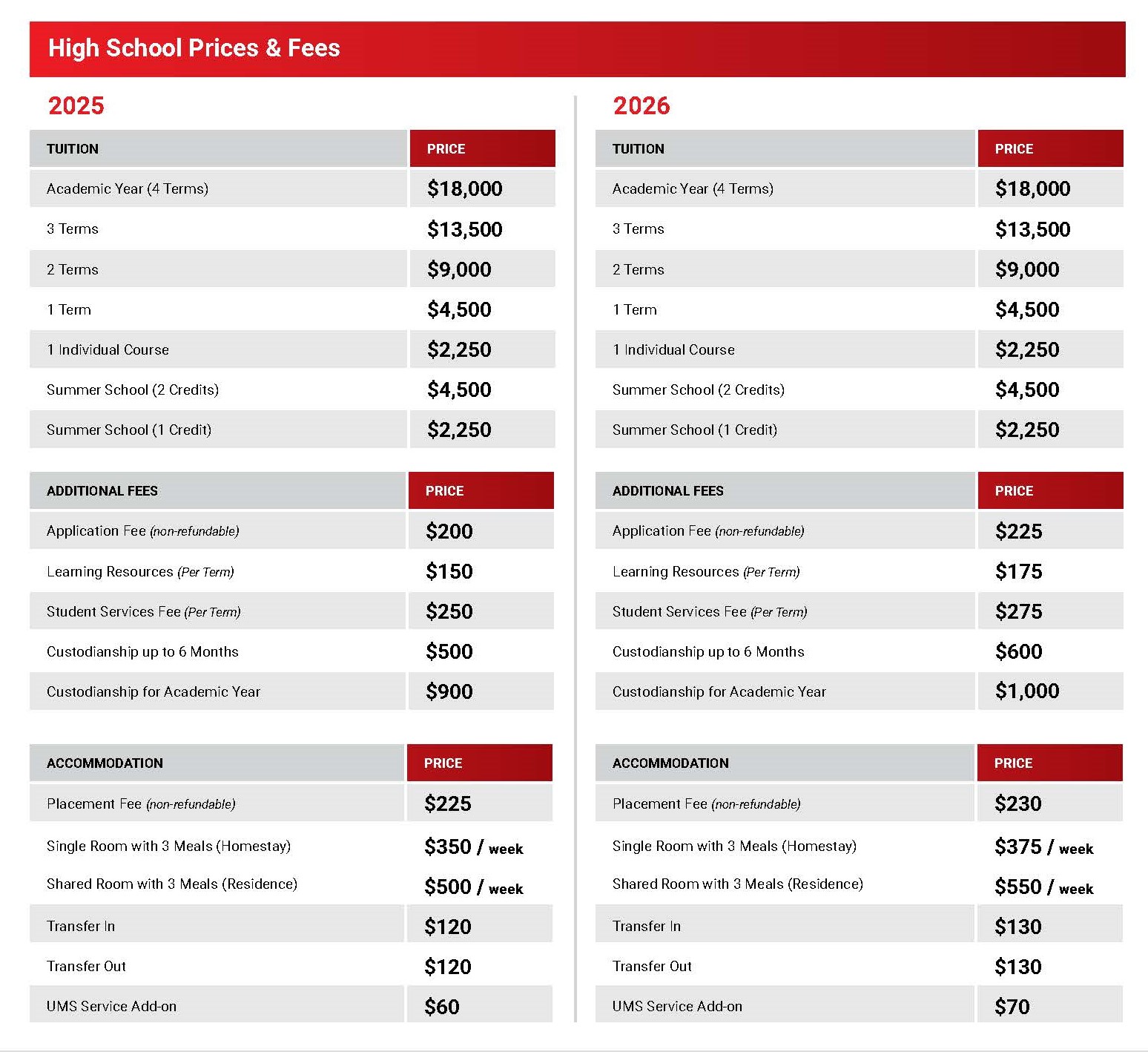 課程的科目可依據學生的喜歡選擇 1 term(2 courses):學習期間平均2個月 (學習長度最終以學校提供的課表為主),可以參考下方的開課日哦!在ILAC IHS國際高中體驗高中課程最低需要報名1Term,以2025至2026年間,預計時間課程時間最少會為期11週,暑期課程(約7週左右)都可以依照自己的規劃進行加選報名!因此非常的彈性以及靈活!