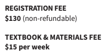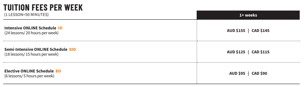 *所有價格均以加元計算。 1節課等於50分鐘。  參加半密集線上課程的學生可能需要 4 週或更長時間才能進入下一級別。升學並不能保證,您升級的能力將取決於您的出勤率、家庭作業的完成情況、個人能力以及對學習的整體投入。
