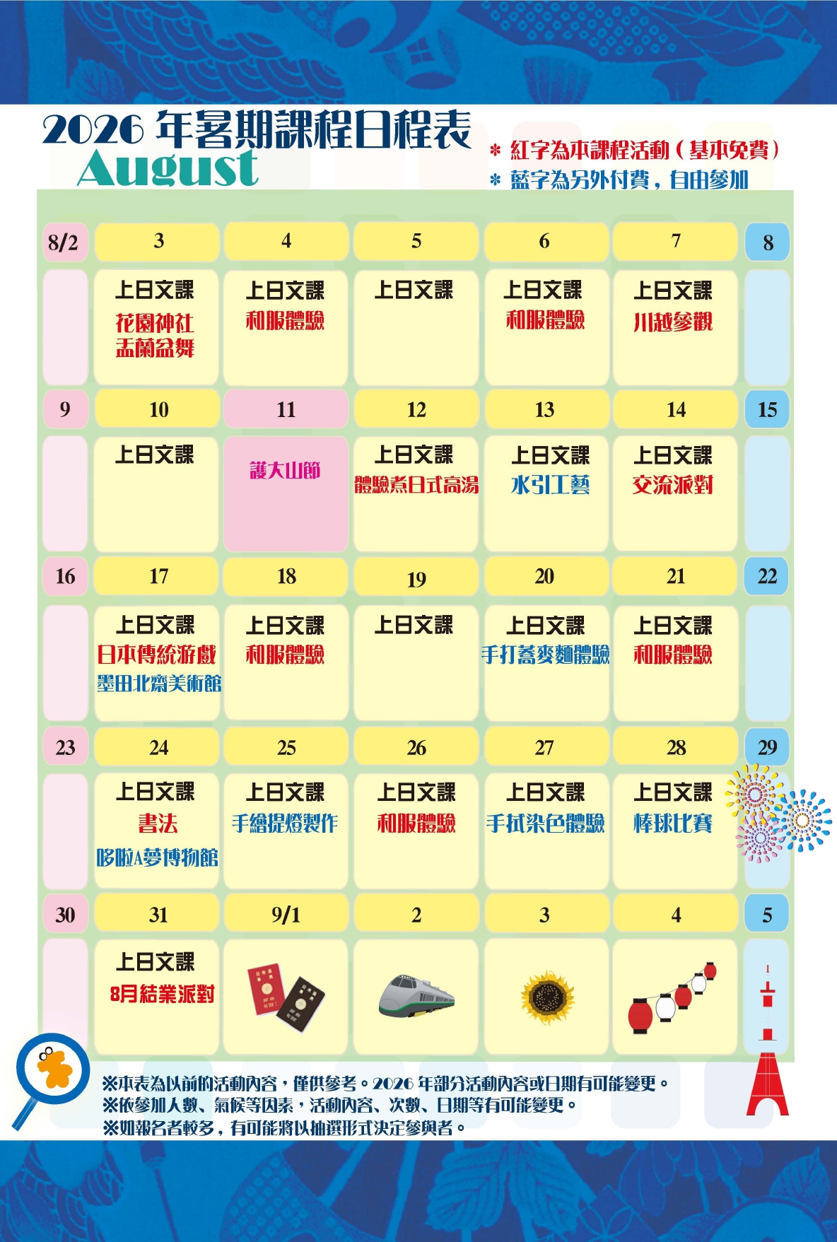 - 依參加人數、氣候等因素,活動內容、次數、日期等有可能變更。