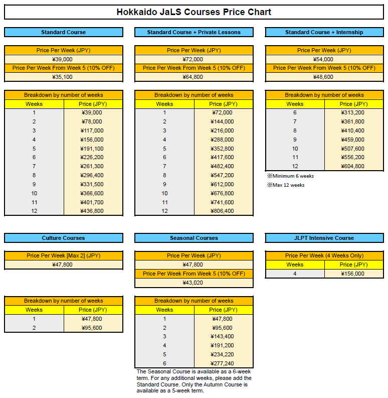 ※課程包含每週兩次發現日本的傳統文化(綠底),其餘活動(灰底)為自費參加,不包含在課程裡,收費金額依學校公告為主。