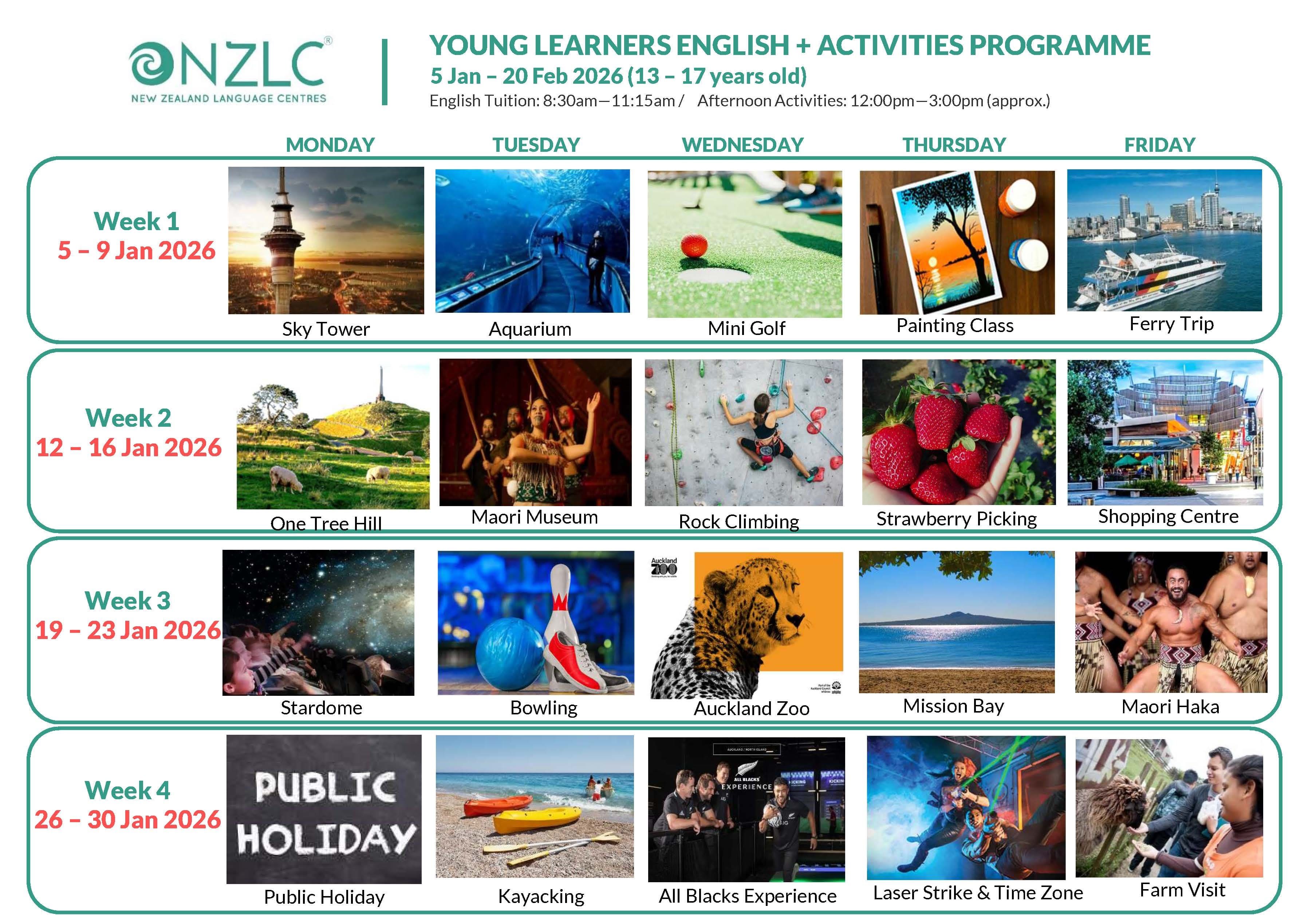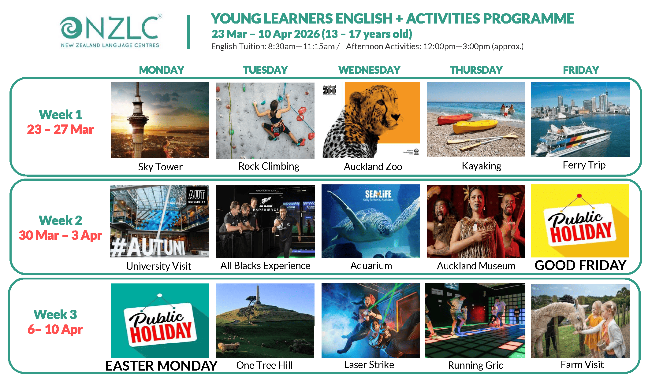 NZLC 成立於 1984 年,是紐西蘭最大的英語學校之一,為各個年齡和背景的學生提供各種高品質的英語語言課程。 NZLC 在新西蘭語言學校 NZQA 排名中名列前茅。我們致力於幫助學生實現他們的語言學習目標,同時為他們創造通往紐西蘭及其他地區新機會的途徑。