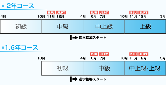 我們提供日本大學入學考試(EJU)和日語能力考試(JLPT)的準備服務,這兩項考試是大學、研究生院和職業學校的入學要求。