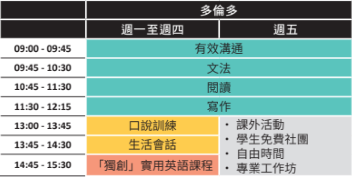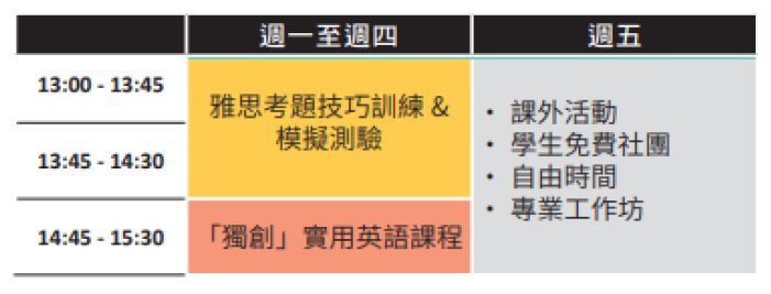 - 語言課程:多層級英語課程、雅思考試準備、商業英語及口語強化班。