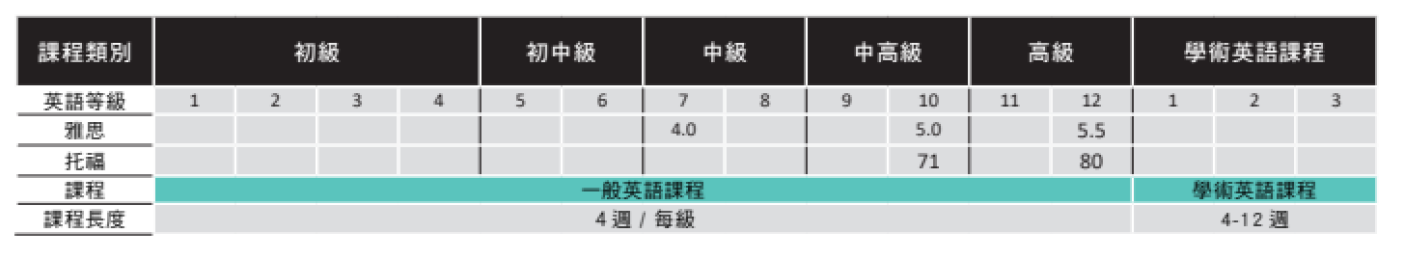 - 依據英語程度,分為中級 & 高級班