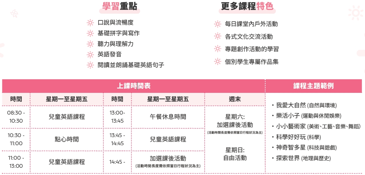針對兒童所設計之英語學習與文化交流體驗, 孩子們將參加多元且有趣的互動式主題英語課程, 豐富的主題課程與校內活動, 培養孩子英語溝通方面的自信心!