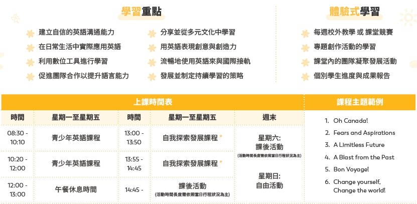 - 學生於課程最後一週五畢業日後, 最後一個週六將不再有週末活動行程