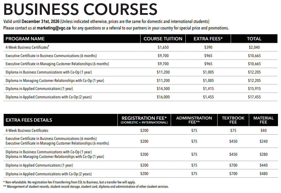 VGC 國際商學院 (School of International Business) 提供專業的商業證書/文憑課程,讓加拿大當地學生和國際學生共同享有最高品質的商業領域教學,不論您是想要短期的一個月證書課程,還是一年的文憑課程,VGC 都能滿足您對未來職場加分的需求!一年的文憑課程更包含了帶薪實習,讓學生可以學以致用,於課程後半段到加拿大當地企業進行實習,不僅可以獲得學術知識,更能取得加拿大職場經驗,海外文憑和工作經驗一次取得!