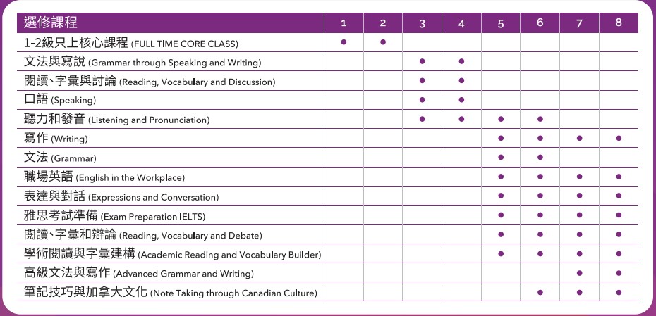綜合的英語課程,涵蓋一般和學術英語技巧,包括口說、聽力、寫作和閱讀,以及文法、詞彙和 發音。擴大詞彙量、增強使用英語的自信心、口說和書寫方面表達更準確流暢。並培養批判性思 考能力及每兩週一次的個人反饋。提供8個等級幫助學生全面提升英語能力,適合各種程度的學習者。