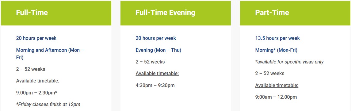 早上半日課程每週13.5小時,當學生到達時,他們會接受文法/詞彙、寫作測試並接受面試。
