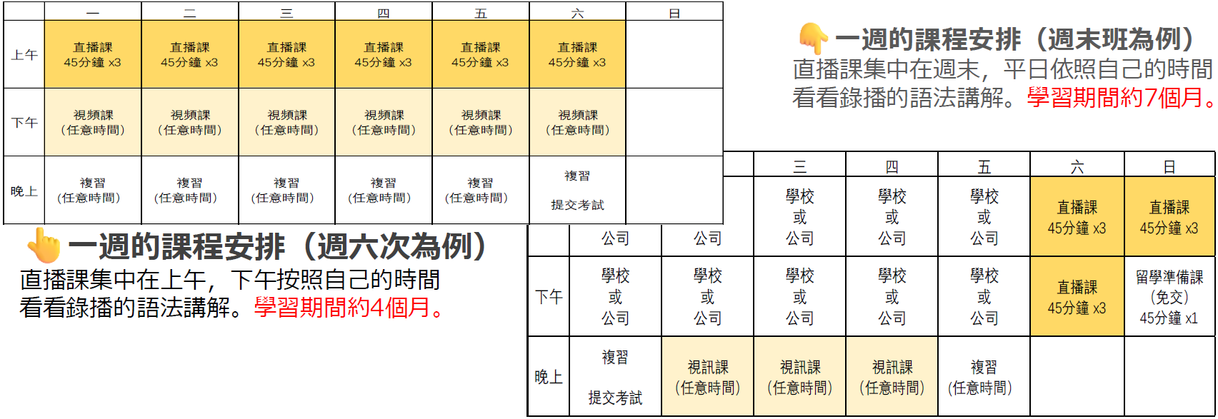 - 平常上課時間外,並設有文法、漢字學習及面試練習的課程時間。