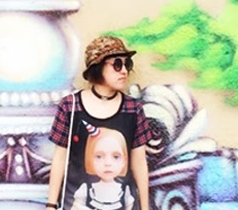 却藏在她一頭紫紅色挑染短髮和高於眉梢的齊瀏海造型