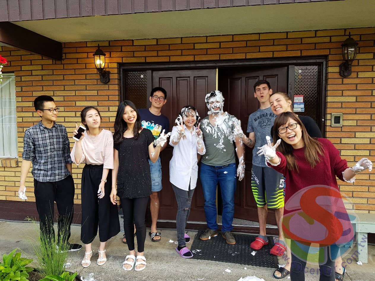 ↑其中一位室友生日,在家裡前院用刮鬍泡攻擊他,但最後大家都淪陷了!