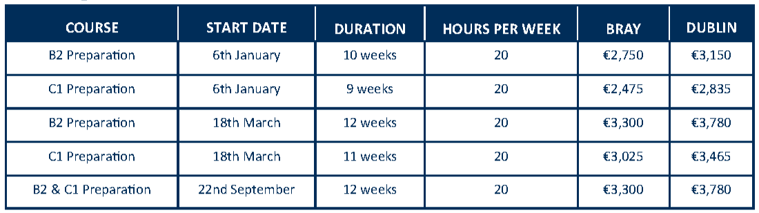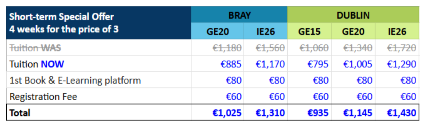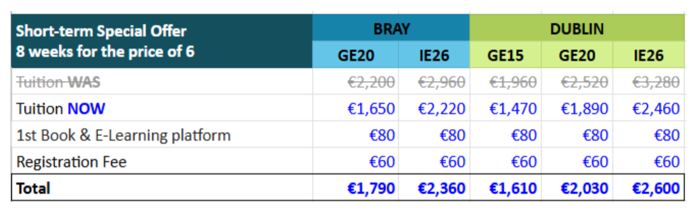 - 適用於 ATC Bray 和 ATC Dublin 的每週 26 小時密集英語課程和每週 20 小時通用英語課程,以及 ATC Dublin 的每週 15 小時通用英語下午課程。