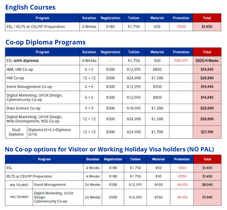 同時報名語言課程+專業課程,語言課程學費半價優惠(CA$875/月)
